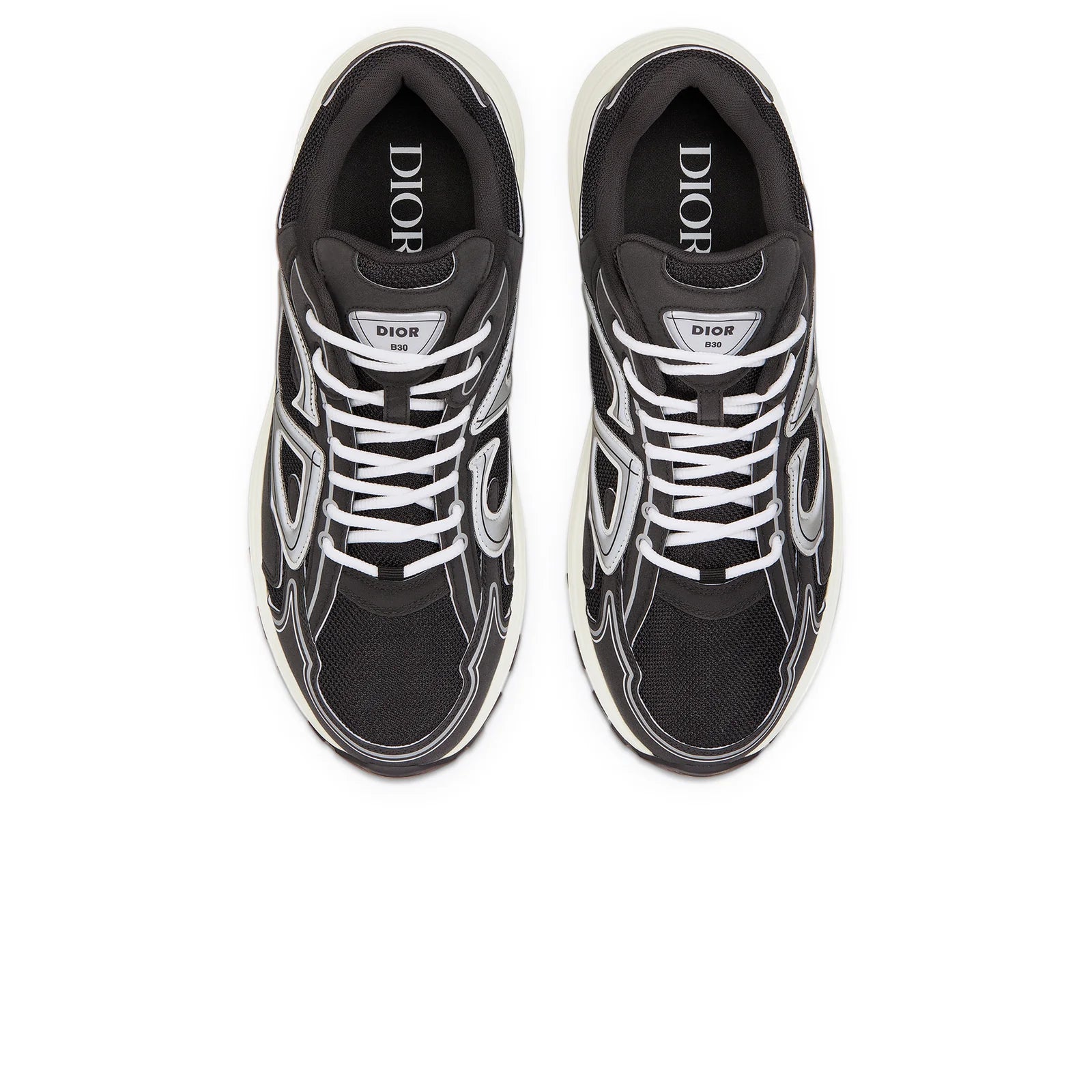 Brand new this season, the B30 low-top sneaker is one of the collection's flagship styles. Crafted in black mesh and technical fabric, it boasts a graphic, reflective 'CD30' signature and is further adorned with 'DIOR B30' and 'CD30' signatures on the back and tongue. Its ultra-lightweight sculpted rubber sole is enhanced with hallmark accents while interior elastic detailing provides optimum comfort. The B30 sneaker will complement any casual outfit with its modern, sporty silhouette.