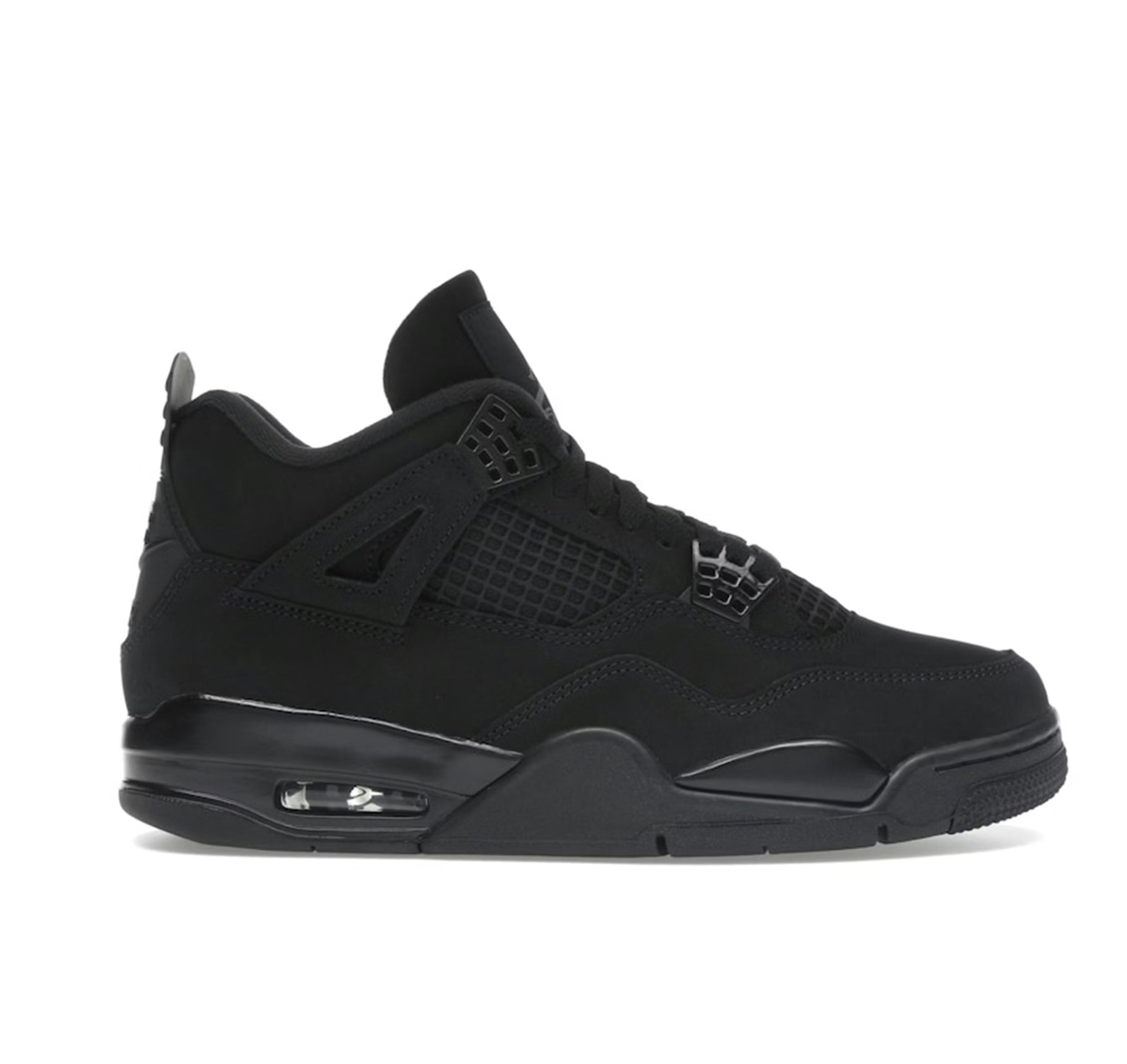 Sleek and stealthy — the Air Jordan 4 “Black Cat” returns in blacked-out nubuck with tonal netting and glossy eyelets. This edition updates the heel with Nike Air branding (a retro nod), while the visible Air unit delivers comfort and heritage.